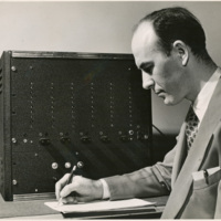 Warfield poses with a piece of computing equipment at the Penn State Computer Laboratory.