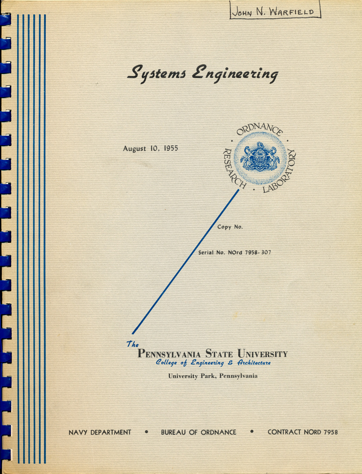 Warfield did research work at Penn State for the military. In this 1955 report published by the Navy Department's Ordnance Research Laboratory, Warfield provides suggestions for effective methods to manage systems.