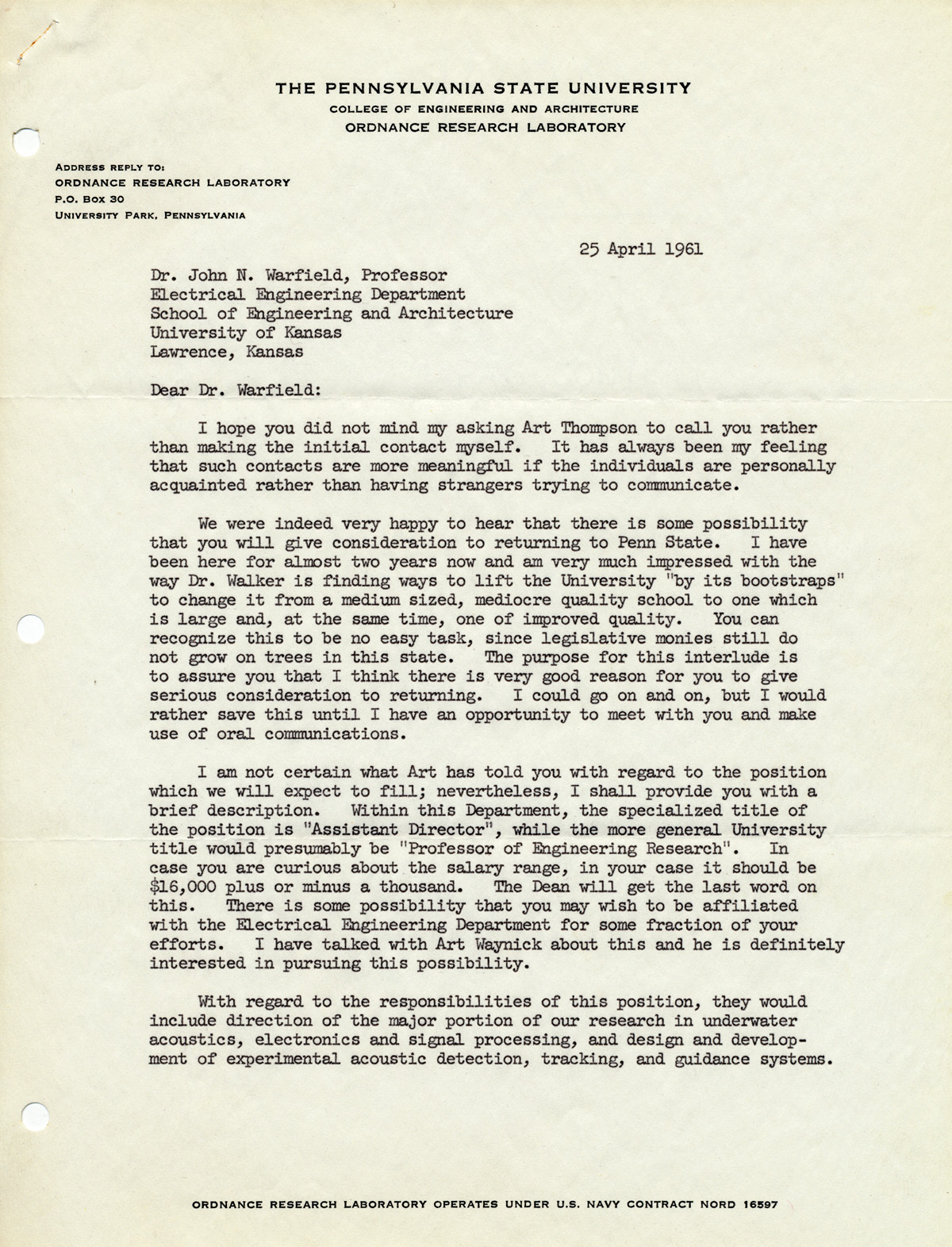 This 1961 letter from John C. Johnson, Director of the Ordnance Research Laboratory at Penn State, discusses the possibility of a return to the university. In goes into great detail on the goals and functions of the Ordnance Research Laboratory.
