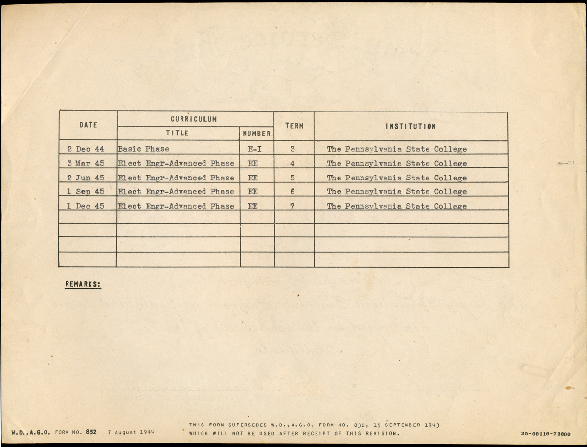 Private Warfield received a certificate upon completion of a series of courses in Electrical Engineering at Penn State taken from December 1944 through December 1945.
