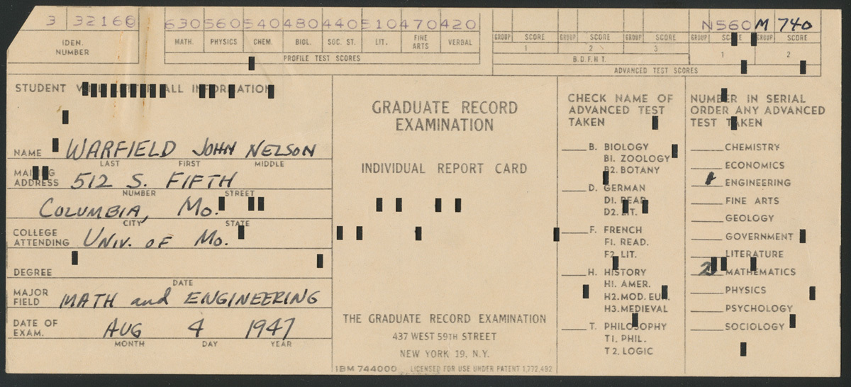 This early computer punch card shows the results of Warfield's 1947 Graduate Record Examination. He scored a 740 on the Advanced Test in Mathematics, placing him above the 98% of all test takers.
