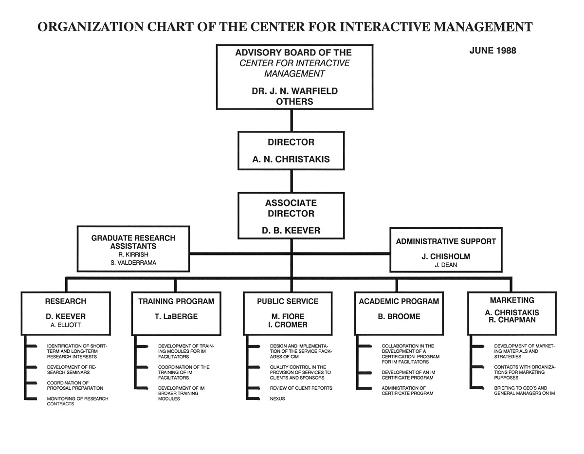 Unknown, "Organization Chart, Center for Interactive Management, 1988," in Dr. John Warfield, Item #194, https://warfield.gmu.edu/items/show/194 (accessed January 15, 2026).