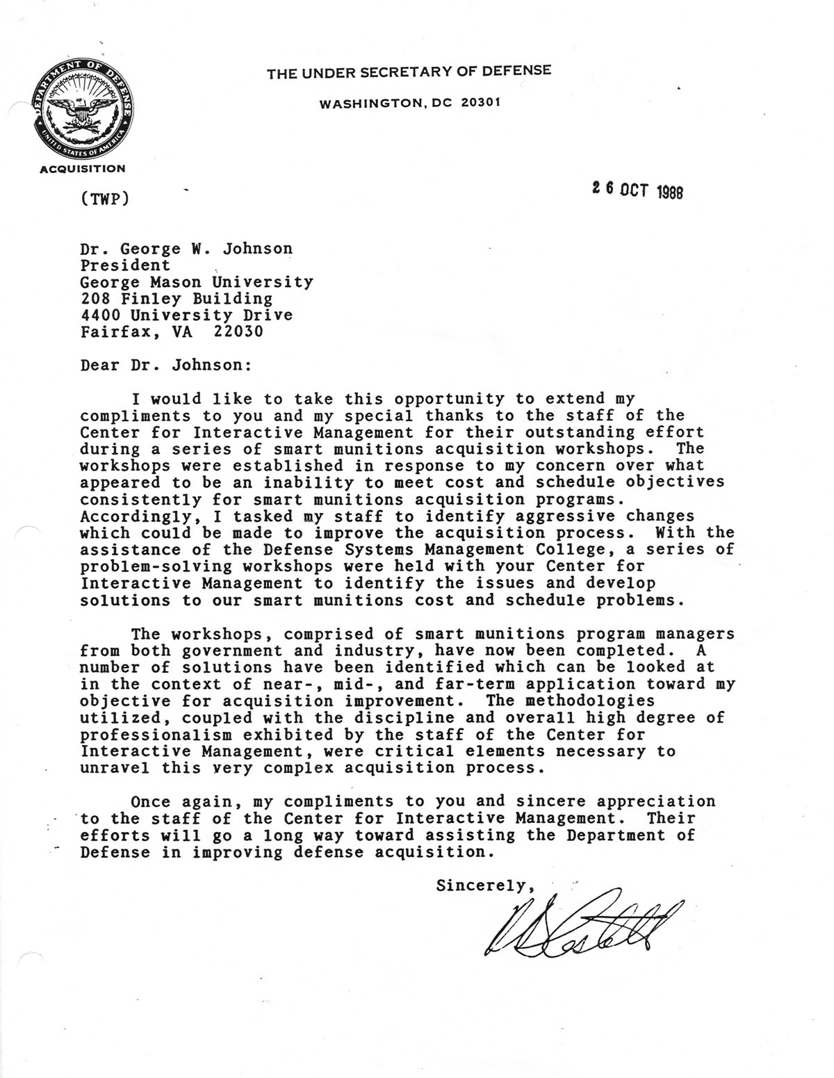 This 1988 letter from the Under Secretary of Defense to George Mason University president George Johnson speaks to the benefits of a recent Interactive Management workshop on defense acquisition.