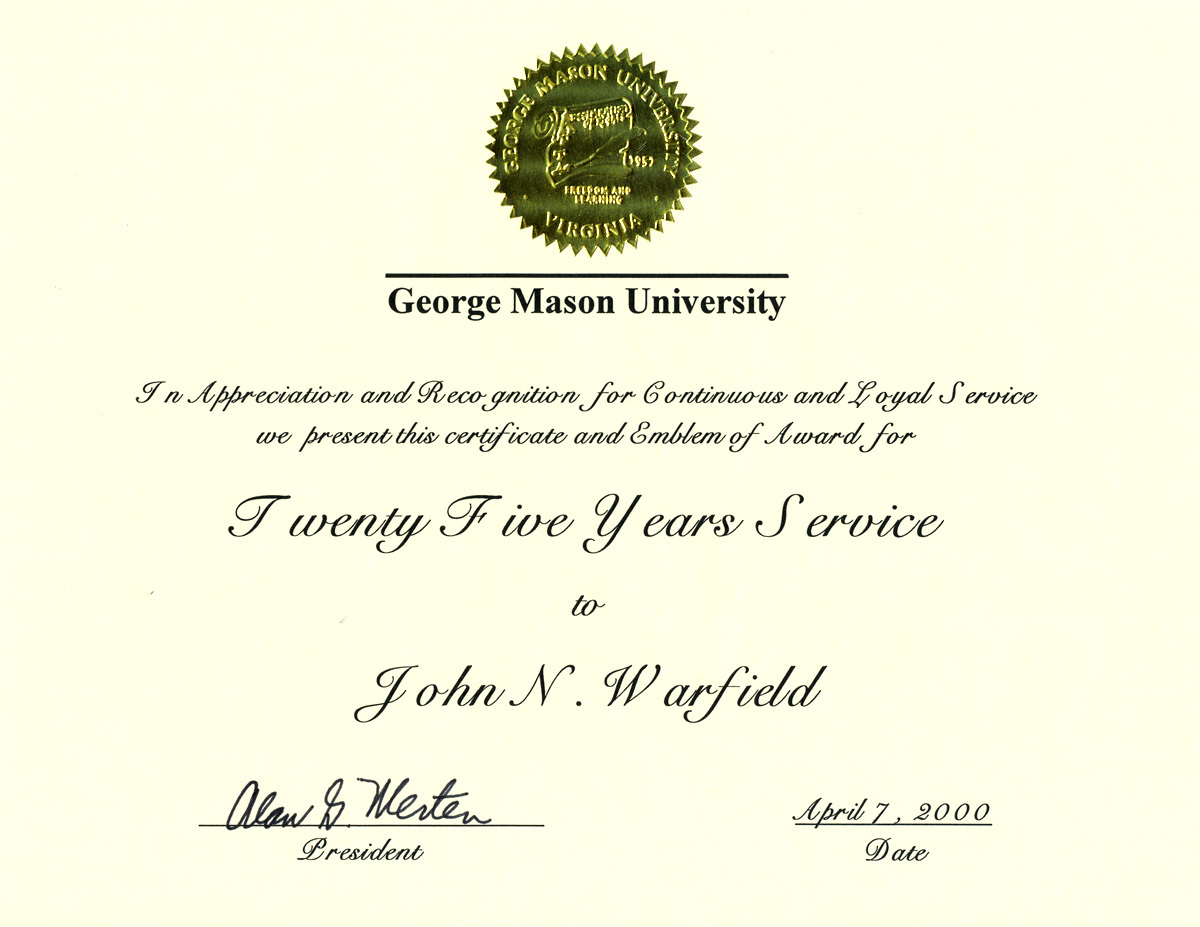 George Mason University, "Award for 25 Years Service to the State of Virginia," in Dr. John Warfield, Item #205, https://warfield.gmu.edu/items/show/205 (accessed January 27, 2026).