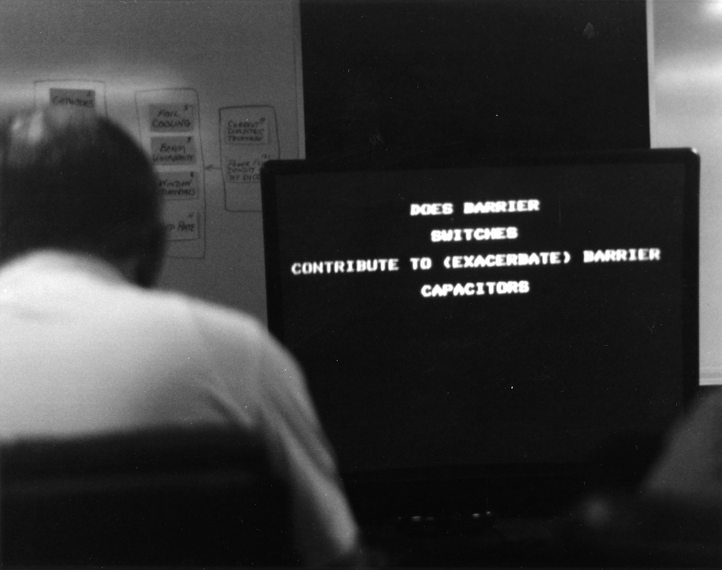 A typical computer generated question is projected on a large screen television monitor during a 1984 IM workshop with the Naval Surface Weapons Center.