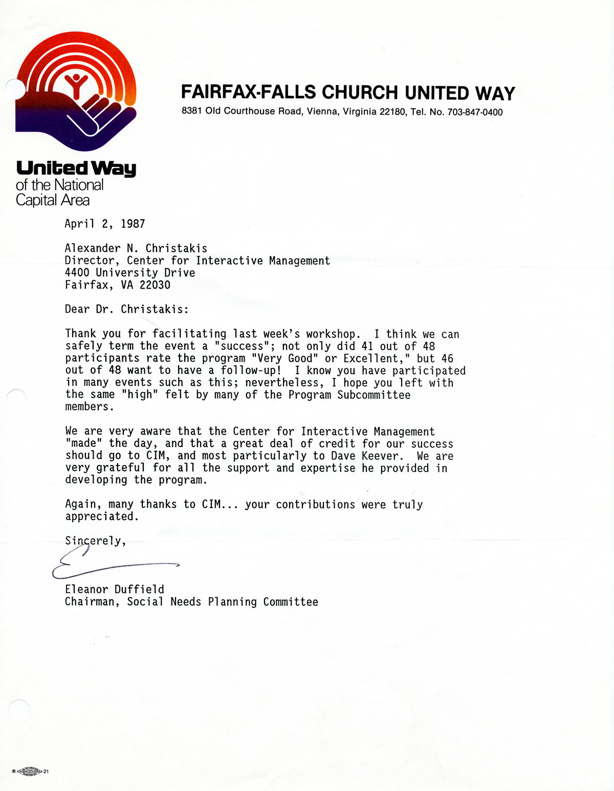Eleanor Duffield, "Letter from United Way Regarding a Successful IM Workshop," in Dr. John Warfield, Item #216, https://warfield.gmu.edu/items/show/216 (accessed January 18, 2026).