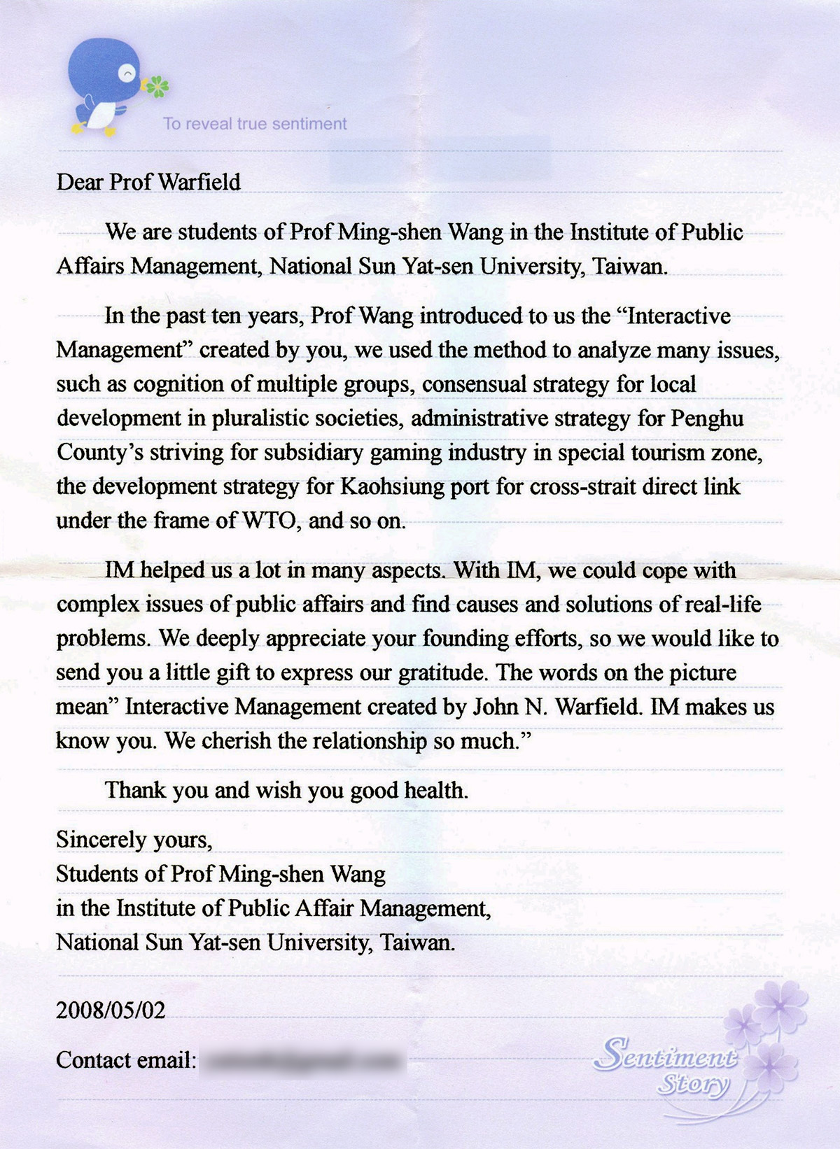 In 2008, students from Taiwan sent an elaborate framed memento to Warfield as a way to thank him for developing Interactive Management. (Note: due to privacy concerns, the contact email information has been removed from this image).
