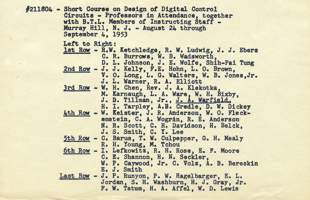 This 1953 photo shows John Warfield with colleagues at the "Short Course on Design of Digital Control Circuits" in Murray Hill, N.J. Warfield is in the third row, fourth from the right.