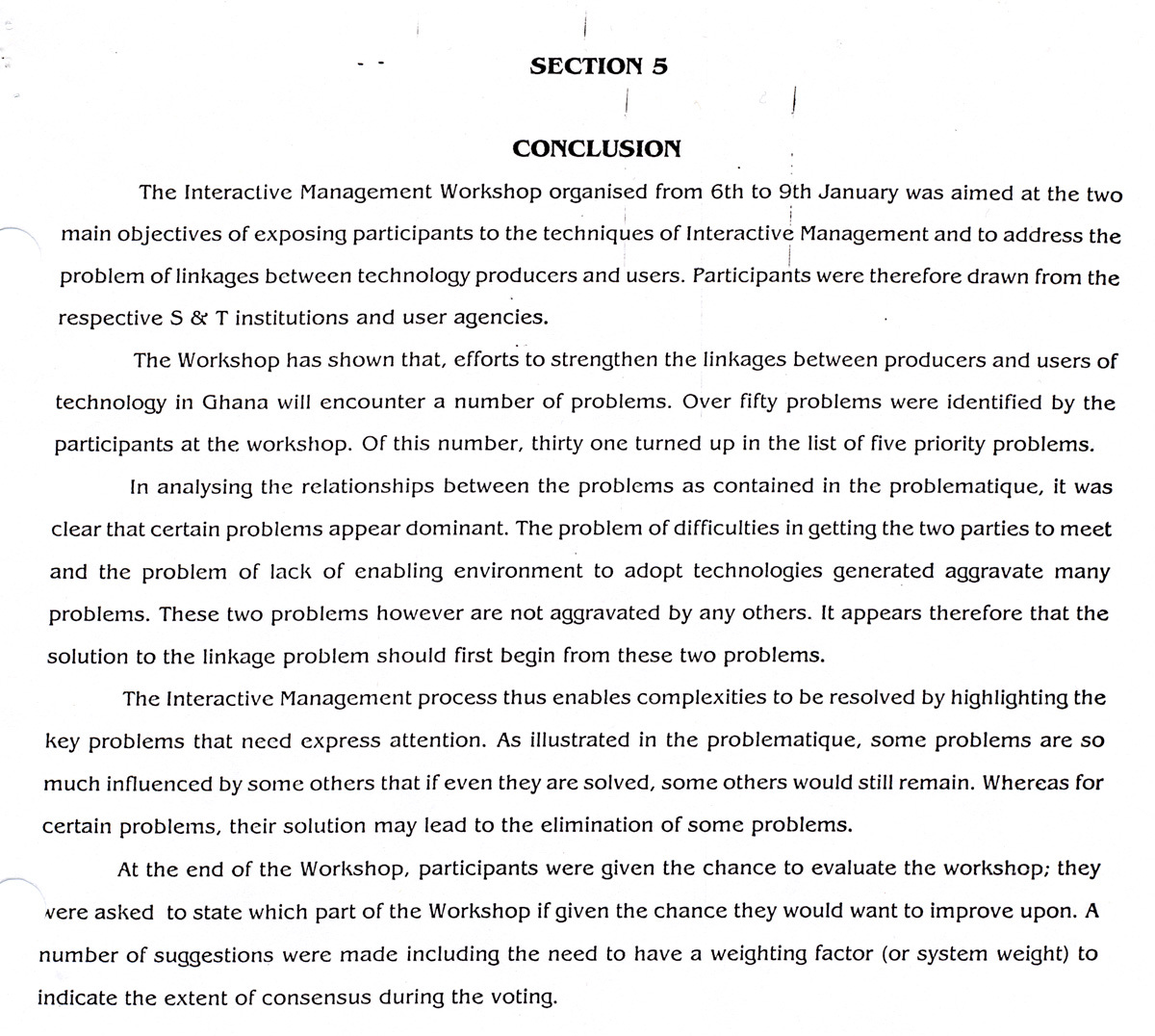 This excerpt from a longer report details the conclusions of an Interactive Management workshop held in 1997 in Ghana, with direction from Warfield.