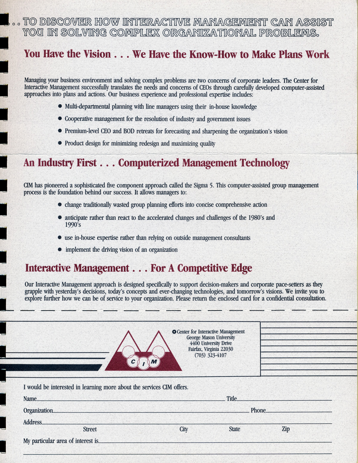 Unknown, "Brochure for Center of Interactive Management," in Dr. John Warfield, Item #230, https://warfield.gmu.edu/items/show/230 (accessed January 25, 2026).