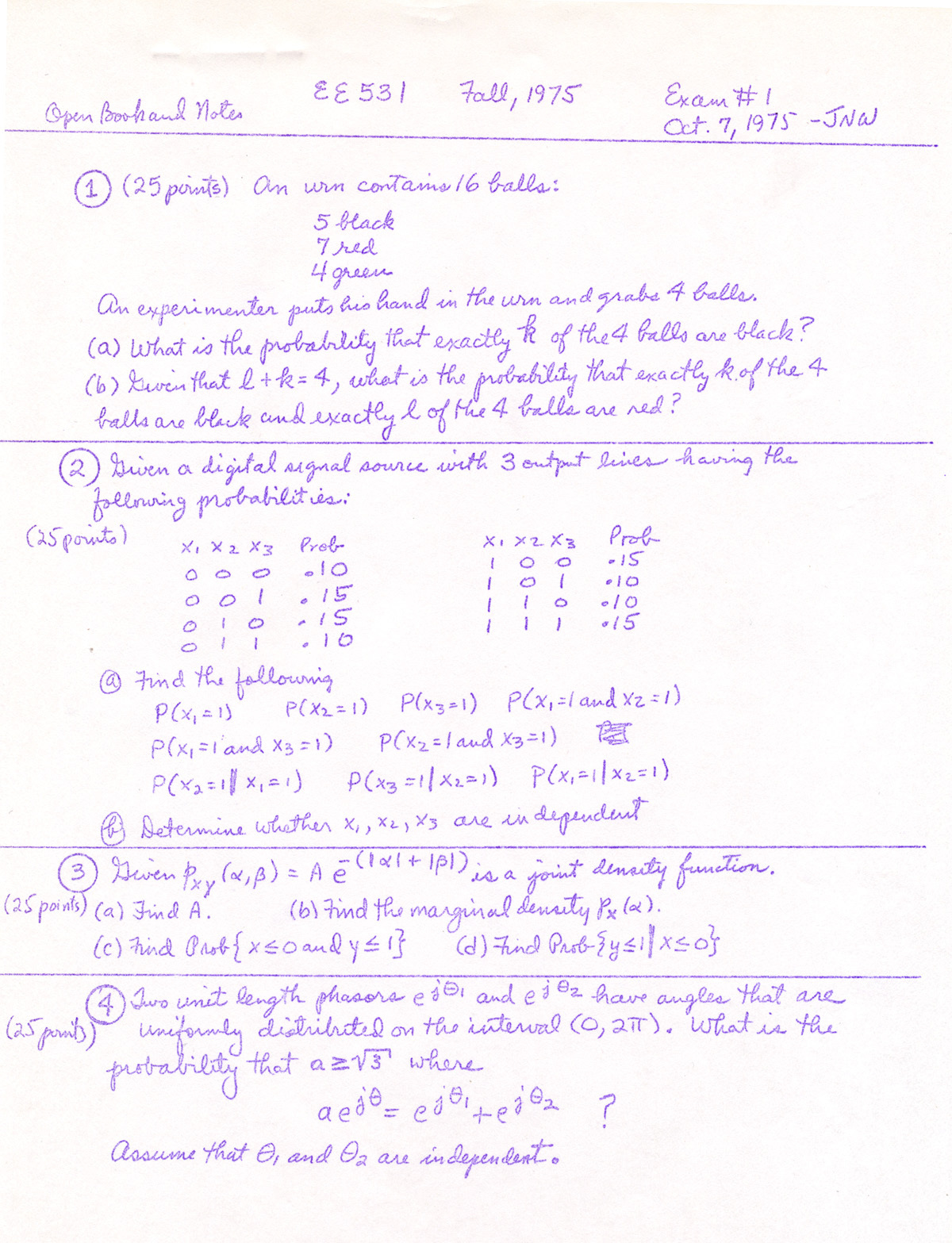 This Fall 1975 test is for an advanced course in Electrical Engineering at the University of Virginia, taught by Warfield.